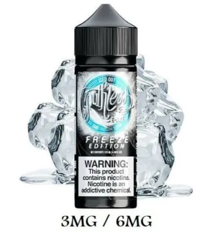 RUTHLESS FREEZE E-JUICE 120 ML  Edition By Ruthless 120ml is gonna take you on an intense ride filled that’s filled with pure strawberries and cool menthol goodness. Providing the most luscious flavor experience, there isn’t anything quite like the taste of it. It shares a mouthwatering flavor that brings you a mixture of strawberries and menthol, leaving you with a strawberry flavor that is extremely refreshing and satisfying. Experience a burst of cold sweet cherries fresh from the freezer with Ruthless Freeze edition - Cherry Bomb. Every puff is a bit of a juicy, cold cherry with just enough tartness to bring out the sweetness. The RUTHLESS FREEZE E-JUICE 120 ML are available in 120ml bottles. Comes in the popular 120ml gorilla bottles for ease of use. The only sensation in Iced out is a simple, refreshing chill. Vaping nothing but sweet flavors can get tiring. Some days, you may feel like your sweet tooth needs a break. That's what Ruthless Freeze Iced Out is for. The Ruthless Freeze Editions are available in 120ml bottles.  Ruthless Freeze Edition, Joosie Red has the flavor of Hoosier apples straight from Indiana's orchards. A freezing blast of menthol helps capture the experience of a cold, crisp apple on a fall day. Carry the experience of Joosie Red wherever you go in a convenient, 120ml . Comes in the popular 120ml gorilla bottles for ease of use. Ruthless WTRMLN Freeze is here! Experience the sensation of a cold, juicy watermelon in your vape. WTRMLN Freeze has the flavor and coolness of a watermelon straight out of the fridge in a portable, 120ml gorilla bottle. WTRMLN is the perfect refreshing all day vape for hot, summer days. The Ruthless Freeze Editions are available in 120ml. Package Contents Include: 1  120ml Freeze Edition  Tfn Vape Juice VG/PG: 70/30