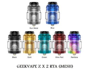 GEEKVAPE Z X 2 RTA (MESH) 4.5 ML The Geek Vape ZEUS X Mesh RTA, featuring a 4.5mL juice capacity, adjustable top airflow control system, and can utilize a mesh coil for rapid and even heating. Constructed from durable stainless steel, the chassis of the Zeus X Mesh RTA is impervious to light and moderate falls and drops. Equipped with a postless build deck, the Zeus X Mesh RTA can utilize mesh sheet coils, side secured via Phillips screws. In the center of the build deck is a spring-loaded ceramic cotton support, lifting the wicking cotton to maintain firm contact with the installed mesh sheet. Top filled by quarter turn, the Zeus X Mesh RTA can hold up to 4.5mL of eJuice within the borosilicate bubble glass. GEEKVAPE Z X 2 RTA (MESH)  4.5 ML Features: 25mm Diameter 4.5mL Maximum Juice Capacity Pyrex Glass Reinforcement Superior Stainless Steel Construction High-Temp Resistant Silica Glass Reinforcement Enlarged Build Deck Dual Clamp Mesh Coil System Single Mesh Coil Side-Secured via Flathead Slotted Screws Spring-Loaded Center Cotton Support PEEK Insulator Efficient Wicking System Enhanced 3D Three Dimensional Airflow Adjustable Dual Exterior Top Airflow - 15mm by 2.5mm Single Internal Central Air Tube - Funels Into Multi-Hole Slots Quarter Turn Top-Fill System 810 Delrin Widebore Drip Tip 810 ULTEM Widebore Drip Tip 510 Drip Tip Adapter 510 Connection Available in Stainless, Black, Blue, Gold, Rainbow  Includes: Geek Vape Zeus X MESH RTA  Replacement Glass Spare Parts Pack  0.17ohm N80 Mesh Sheet Coil 2  0.2ohm KA1 Mesh Sheet Coil 2  Agleted Cotton Laces